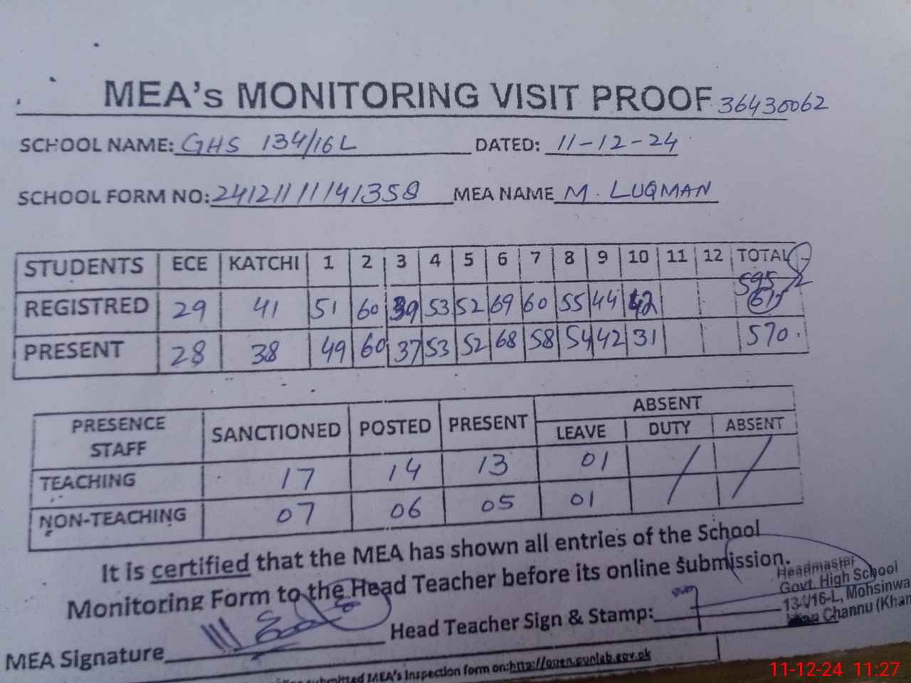 | EMIS Code: 36430062 | Name of School: GHS 134/16-L NEAR RAILWAY STATION, MIAN CHANNU | |||
