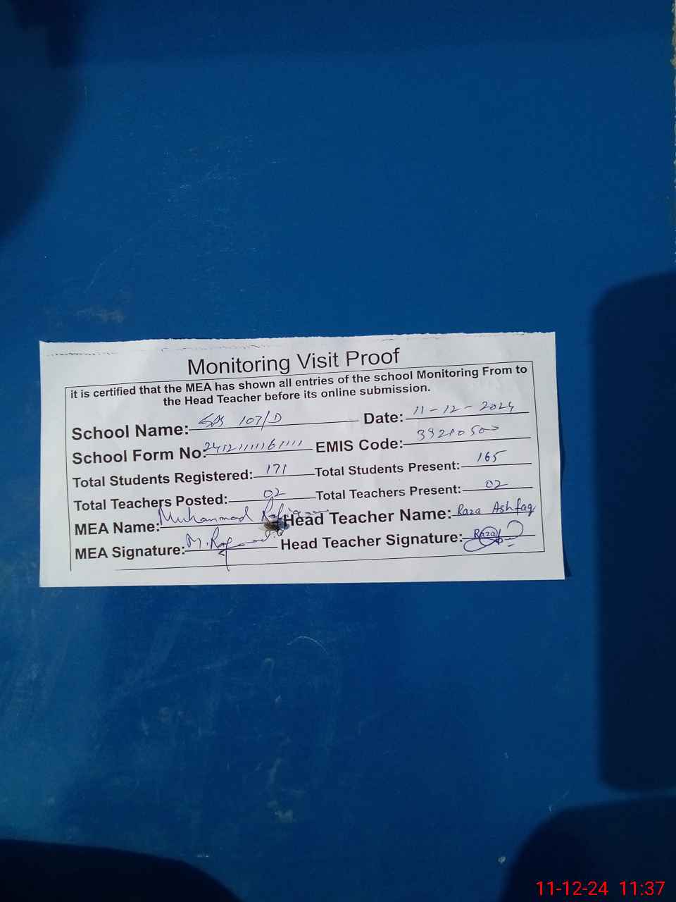 | Attendance Register | Head Teacher | MEA with School | Visit Proof |
