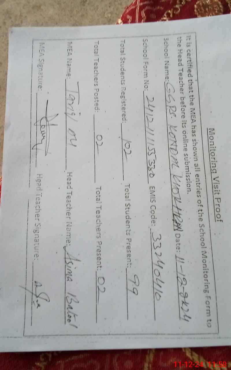 | Attendance Register | Head Teacher | MEA with School | Visit Proof |
