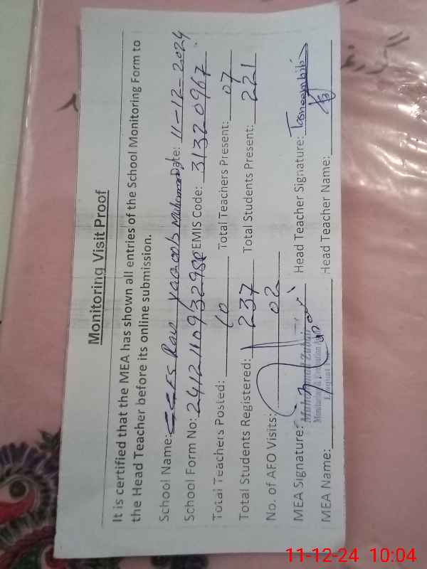 | Attendance Register | Head Teacher | MEA with School | Visit Proof |