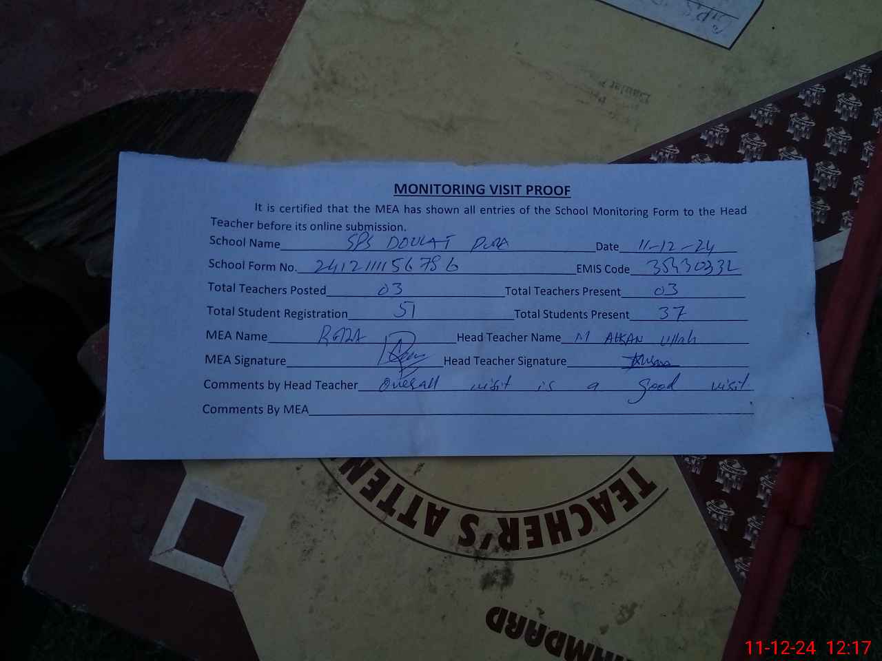 | Attendance Register | Head Teacher | MEA with School | Visit Proof |