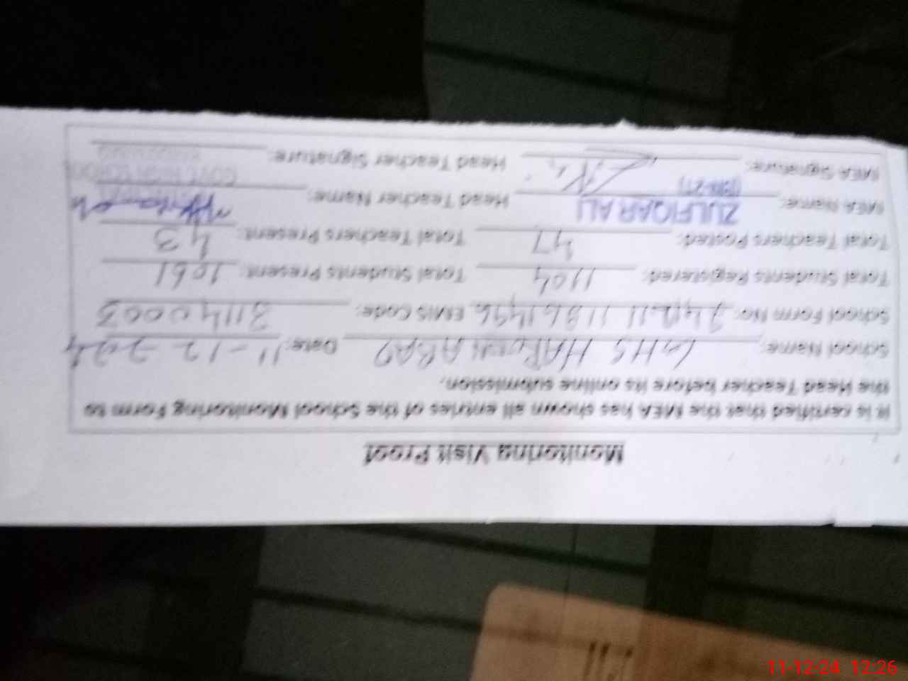 | Monitoring Date: 11-12-2024 | Start Time: 11-12-2024 11:26 AM | End Time: 11-12-2024 12:26 PM | Name of MEA: Zu**** Al**** BN**** | |