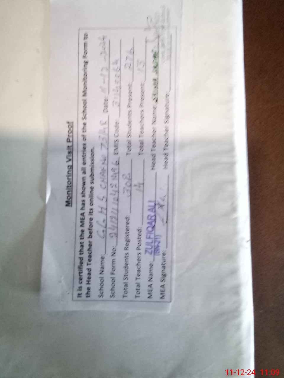 | Monitoring Date: 11-12-2024 | Start Time: 11-12-2024 10:42 AM | End Time: 11-12-2024 11:09 AM | Name of MEA: Zu**** Al**** BN**** | |