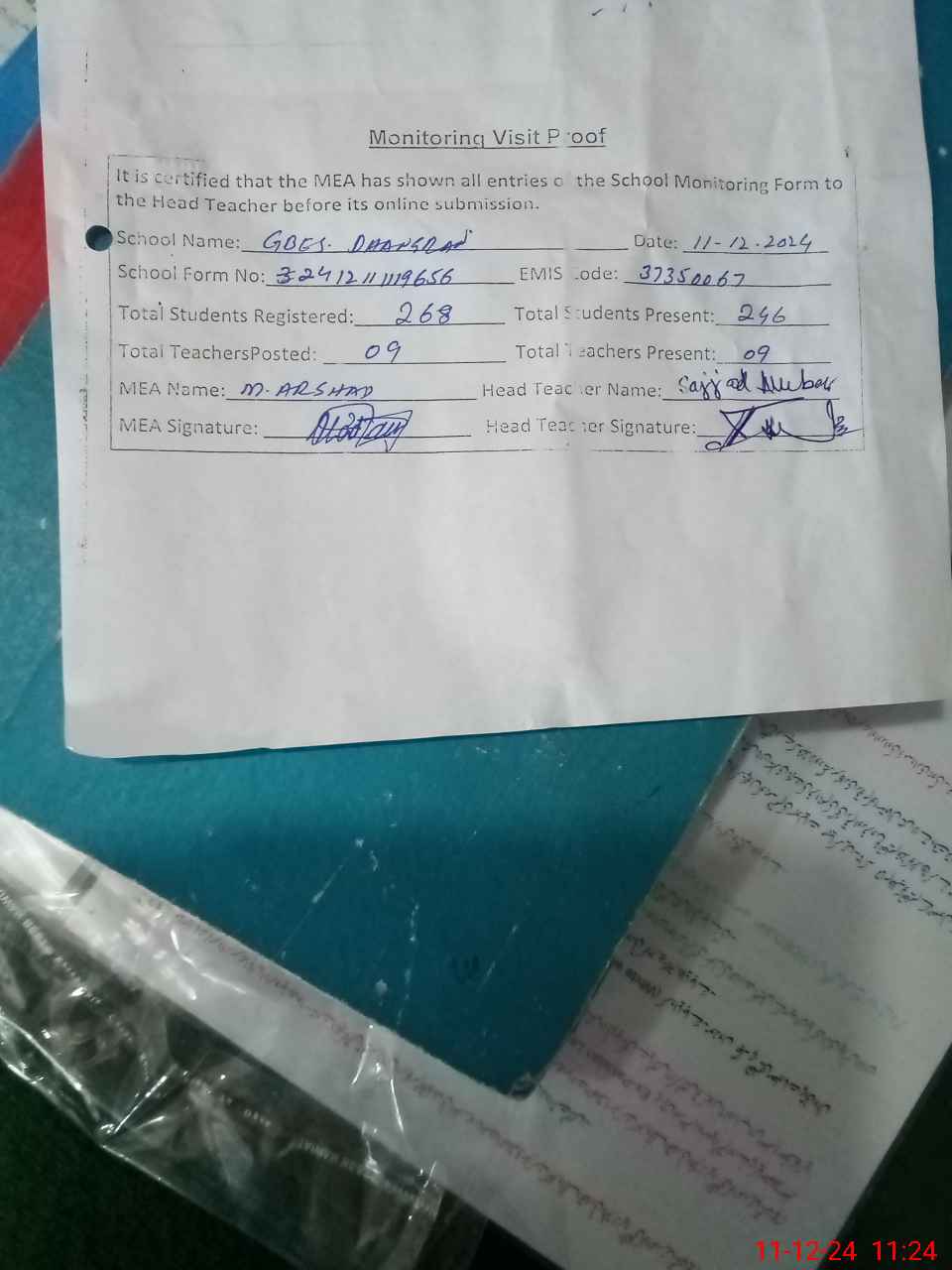 | Attendance Register | Head Teacher | MEA with School | Visit Proof |