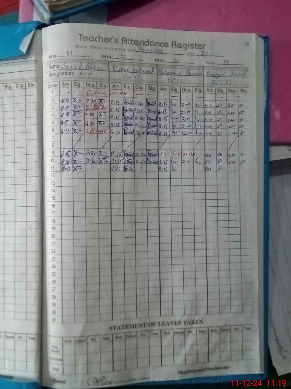 | CNIC | Full Name | Designation | R/C | Absence During Last Calender Month |