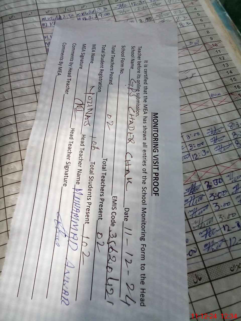 | Attendance Register | Head Teacher | MEA with School | Visit Proof |