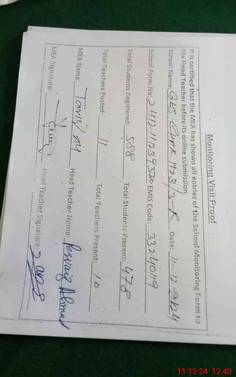 | Attendance Register | Head Teacher | MEA with School | Visit Proof |