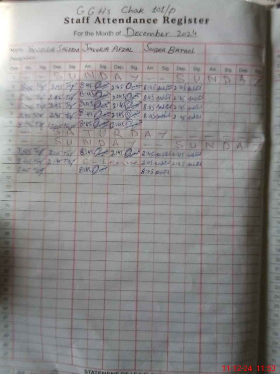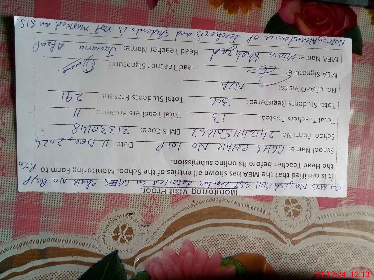 | Remarks (Use Separate Page if Required): 1 Attendance of teachers and students is not marked on SIS 2 Mrs Nazish Gull SST teacher detailed in GGES Chak 80 P till the finalization of Inquiry Letter No CEO DEA RYK 3380 dated 02 April 2024 | |||||