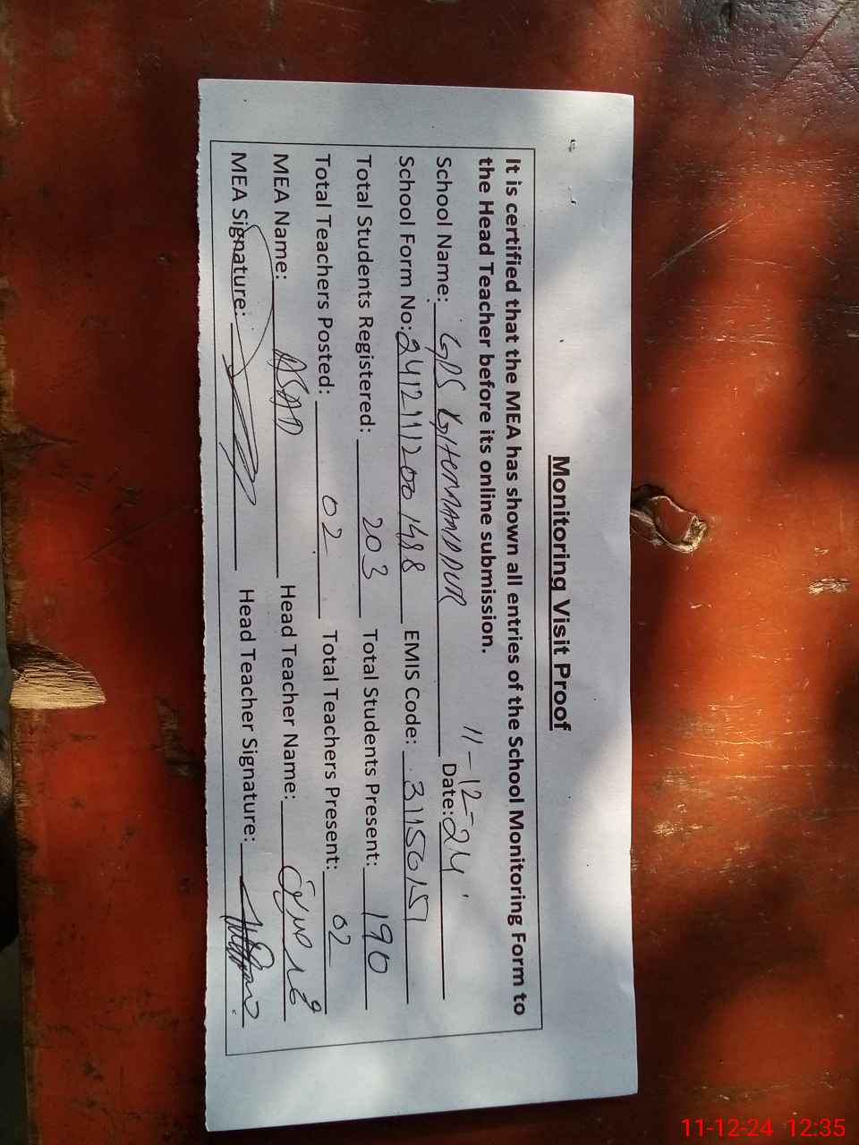 | Attendance Register | Head Teacher | MEA with School | Visit Proof |