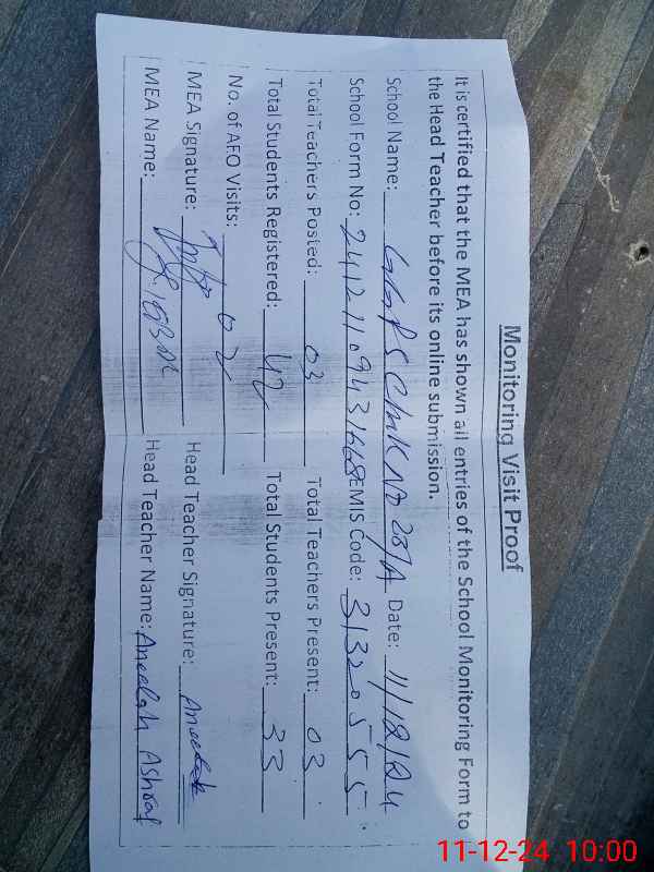 | Attendance Register | Head Teacher | MEA with School | Visit Proof |