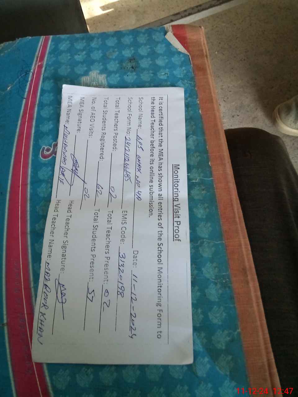 | Attendance Register | Head Teacher | MEA with School | Visit Proof |