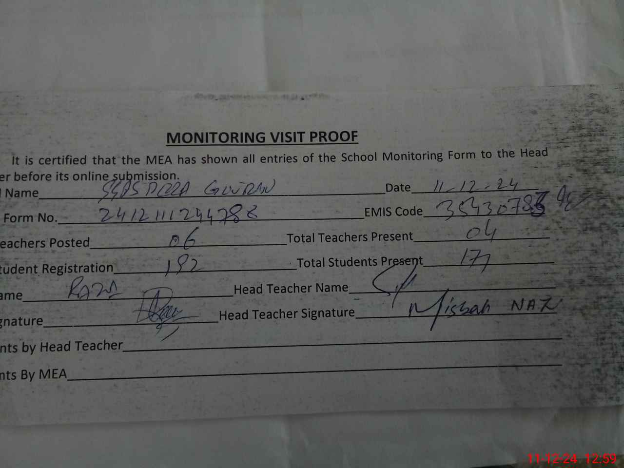 | Monitoring Date: 11-12-2024 | Start Time: 11-12-2024 12:36 PM | End Time: 11-12-2024 01:47 PM | Name of MEA: Ra**** Hu**** Gi**** | |