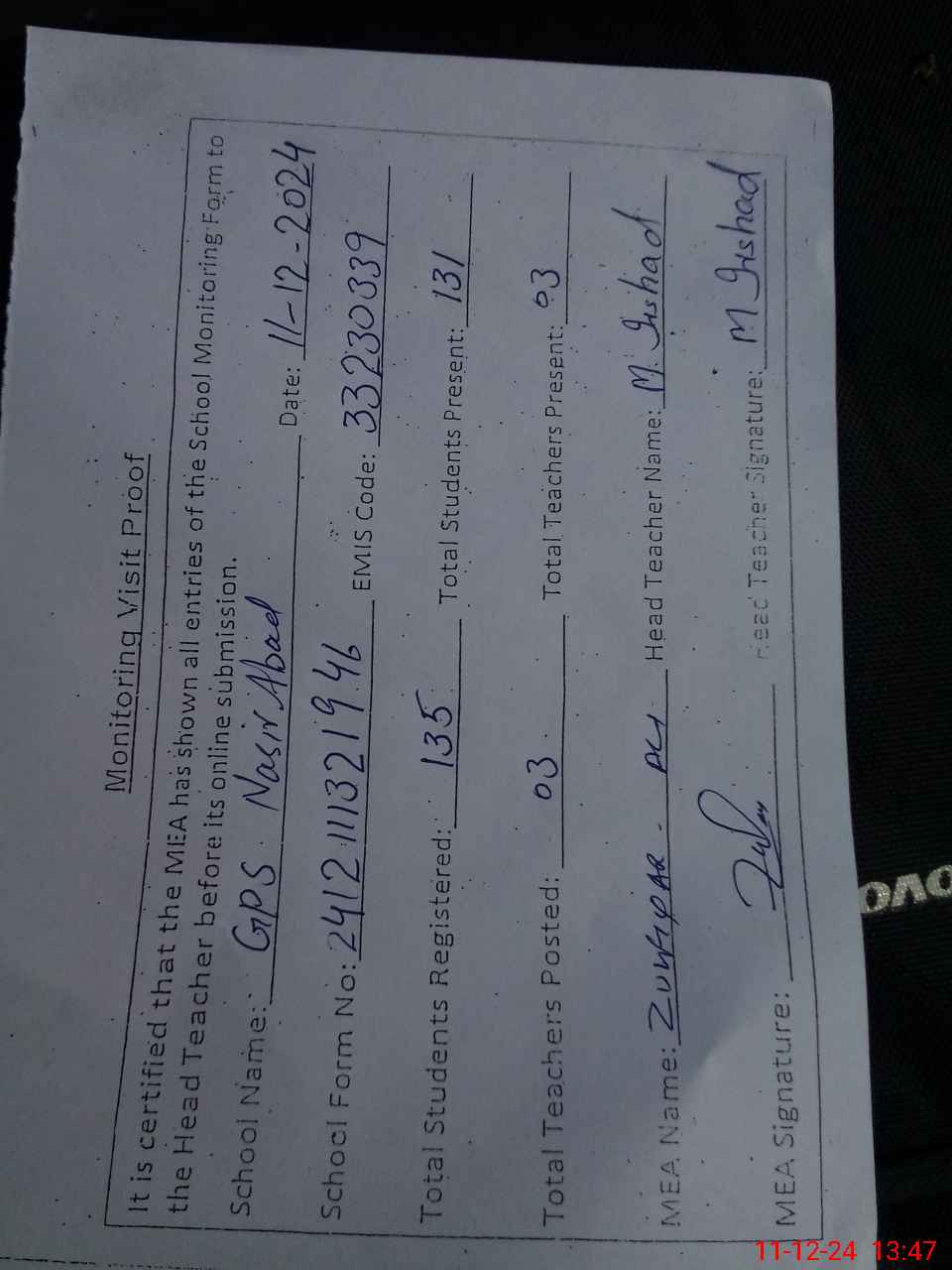 | Attendance Register | Head Teacher | MEA with School | Visit Proof |
