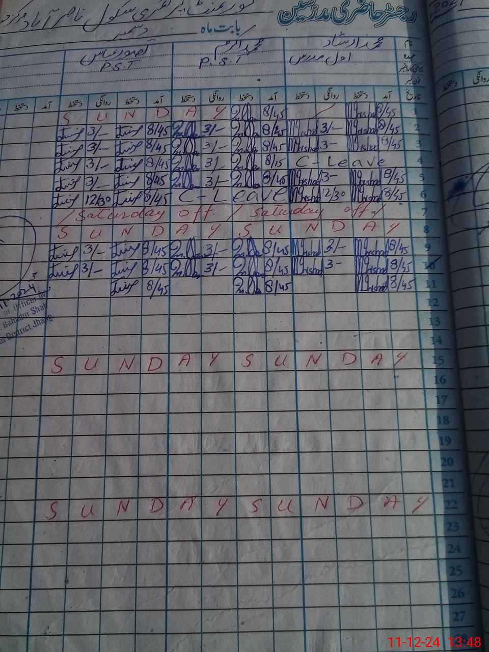 | CNIC | Full Name | Designation | R/C | Absence During Last Calender Month |