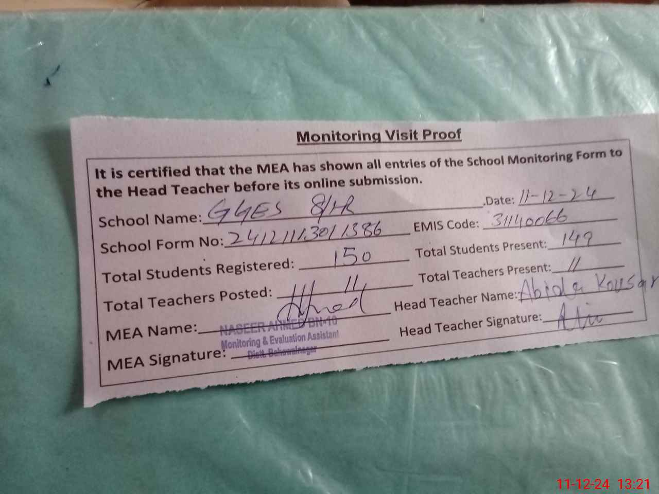 | Attendance Register | Head Teacher | MEA with School | Visit Proof |
