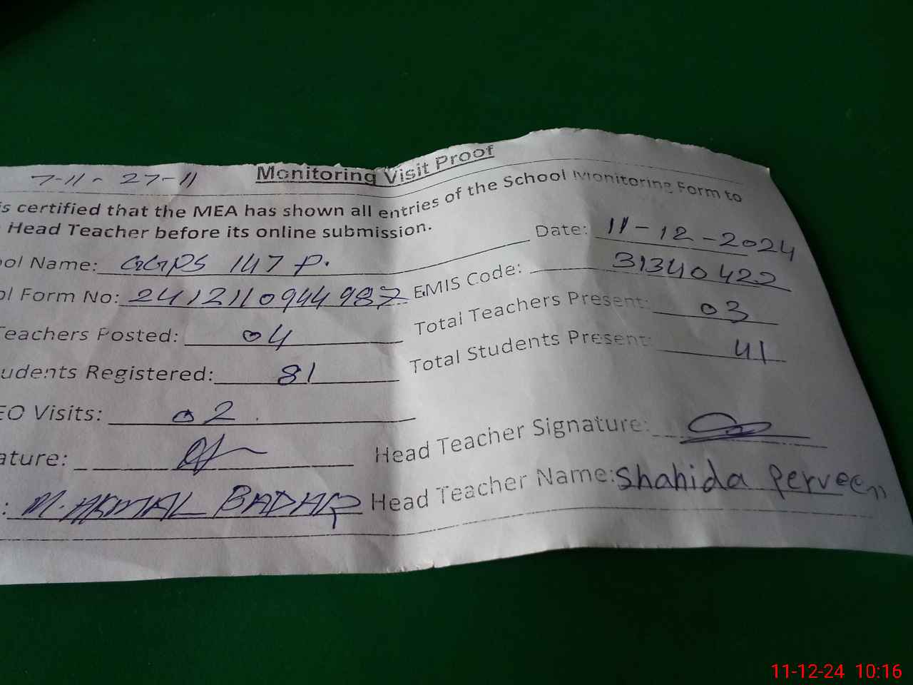 | Monitoring Date: 11-12-2024 | Start Time: 11-12-2024 09:44 AM | End Time: 11-12-2024 10:16 AM | Name of MEA: Mu**** Ak**** Ba**** | |