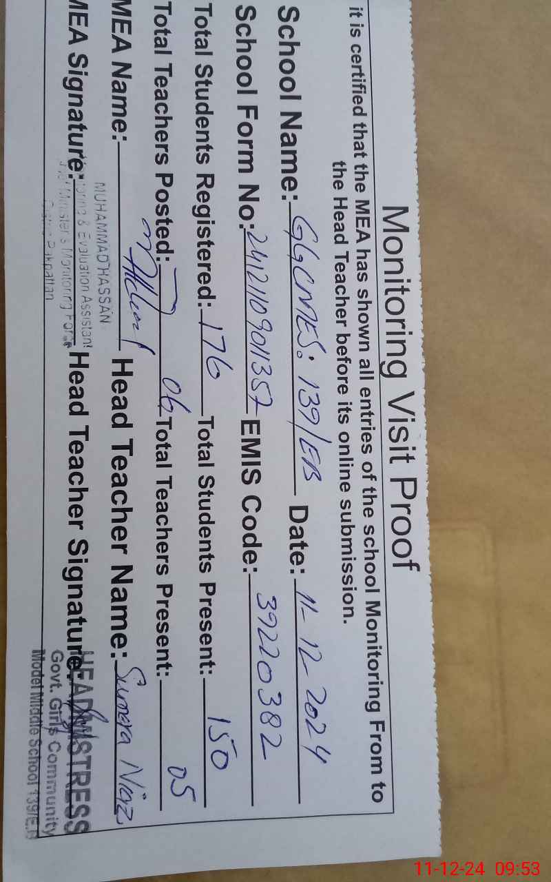 | EMIS Code: 39220382 | Name of School: GGCMES 139 EB ARIFWALA | |||
