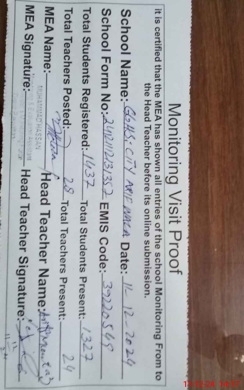 | EMIS Code: 39220549 | Name of School: GGHS CITY ARIFWALA | |||