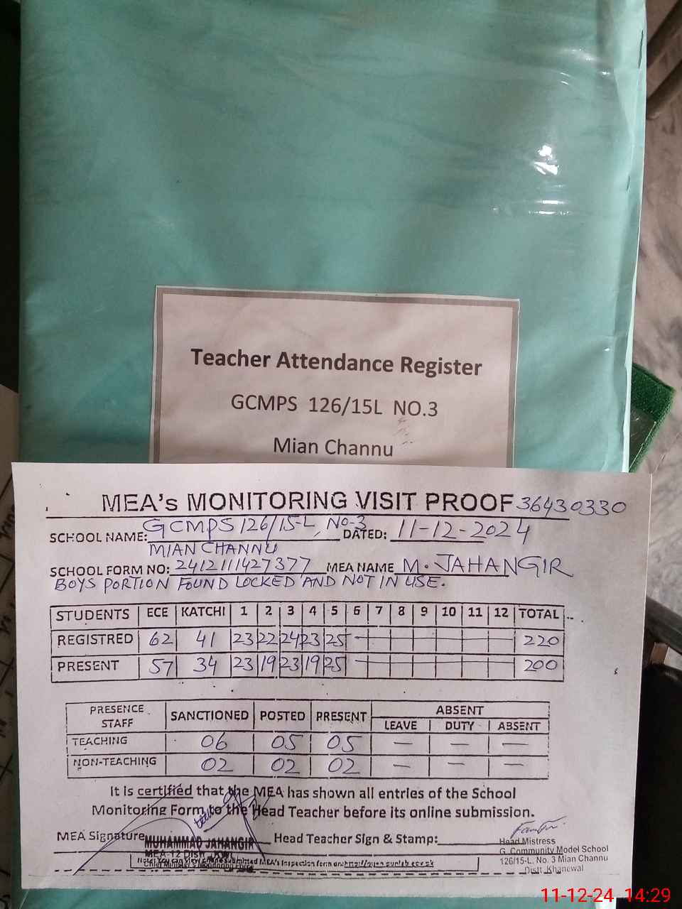 | Attendance Register | Head Teacher | MEA with School | Visit Proof |