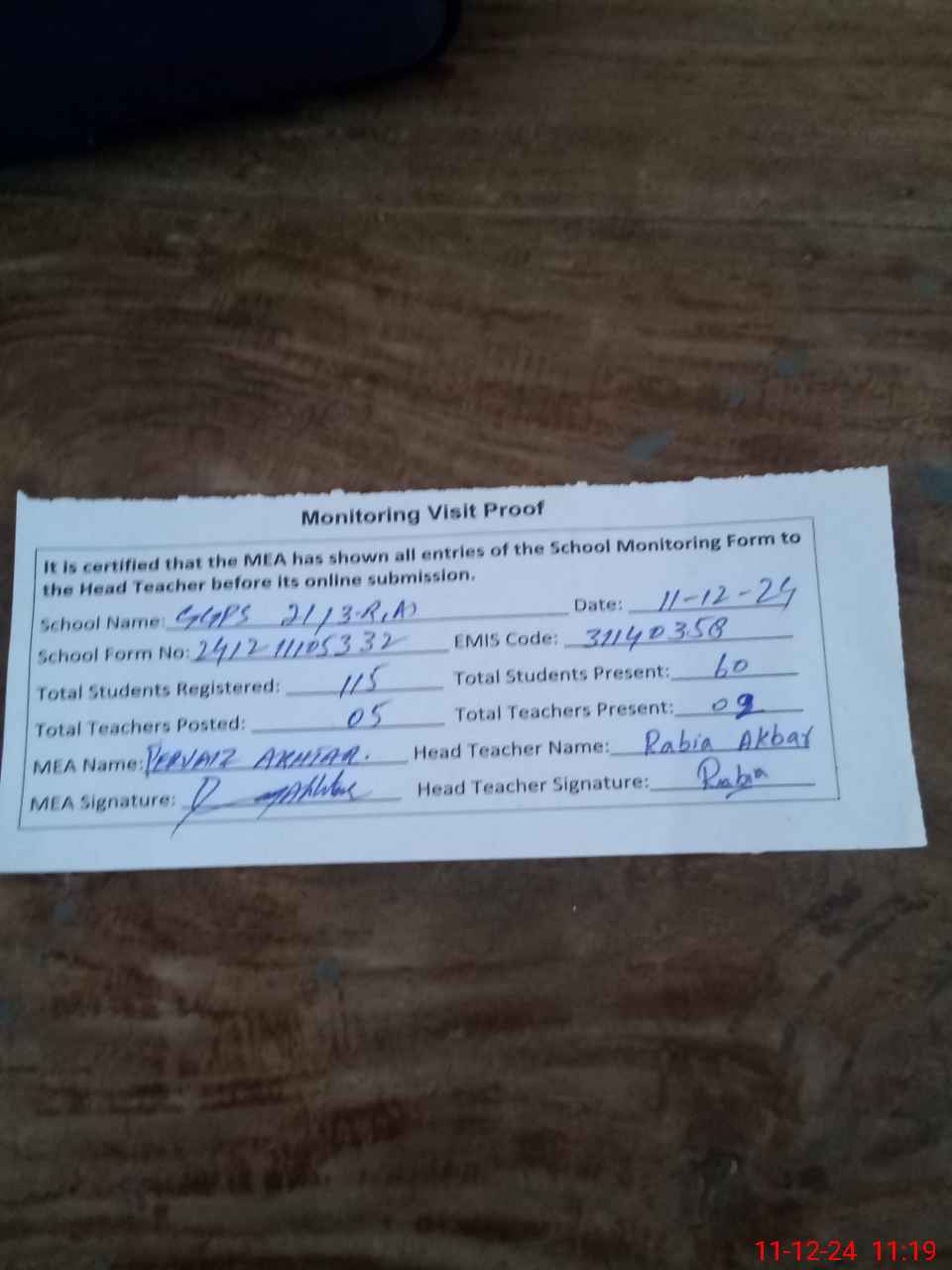 | Monitoring Date: 11-12-2024 | Start Time: 11-12-2024 10:53 AM | End Time: 11-12-2024 11:19 AM | Name of MEA: Pe**** Ak**** BN**** 12 | |