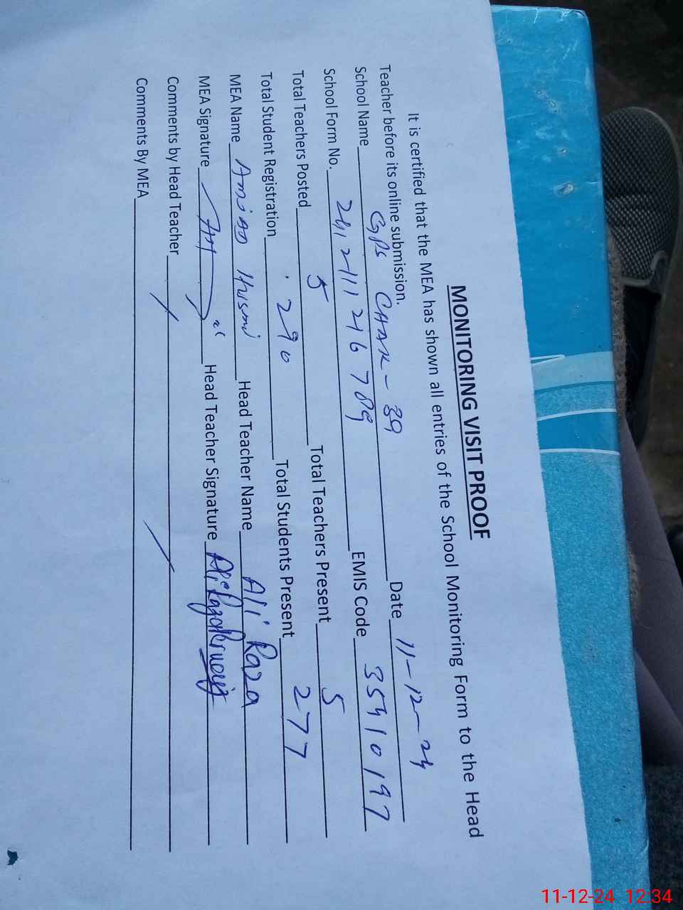 | Attendance Register | Head Teacher | MEA with School | Visit Proof |