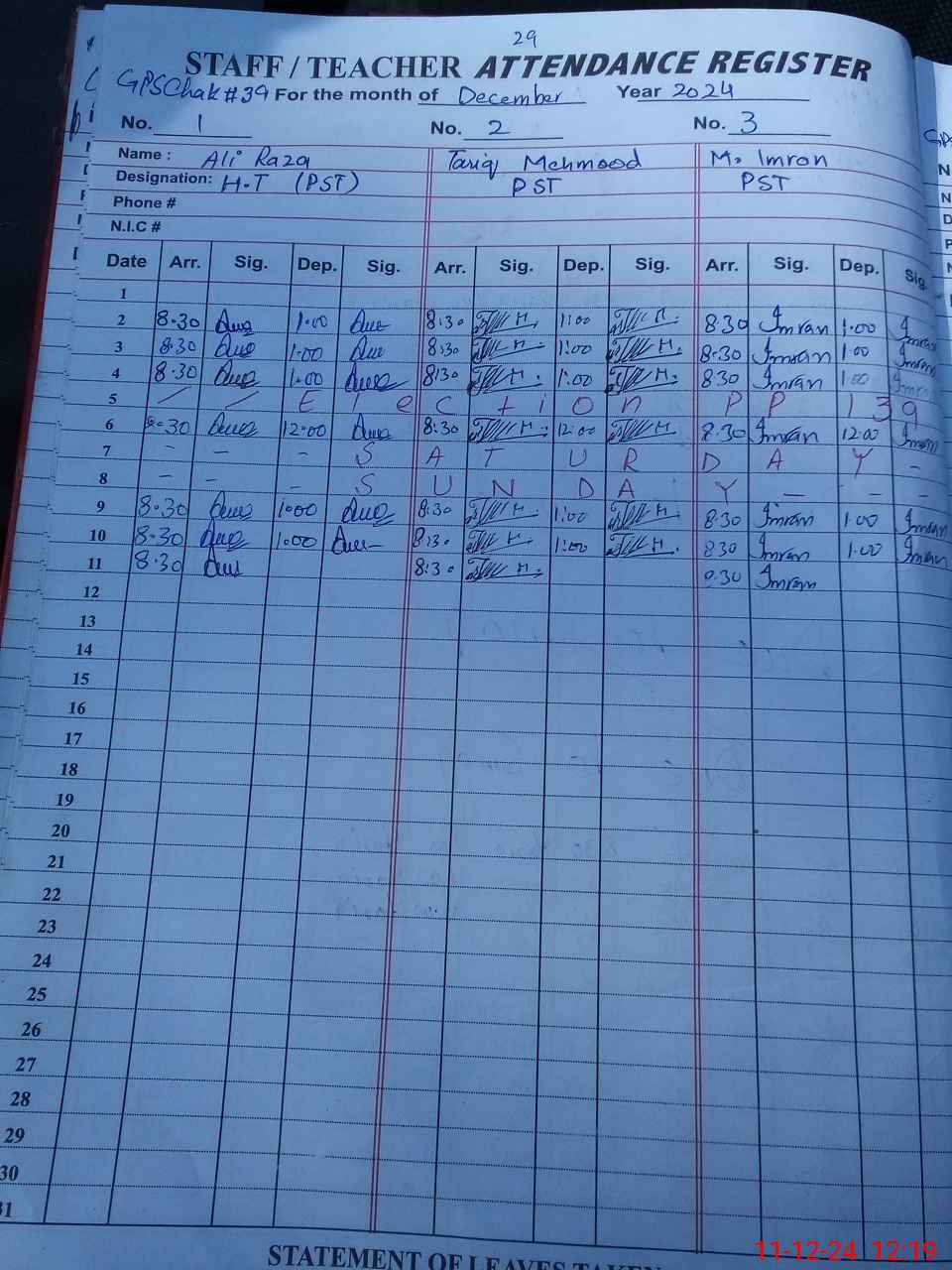 | CNIC | Full Name | Designation | R/C | Absence During Last Calender Month |