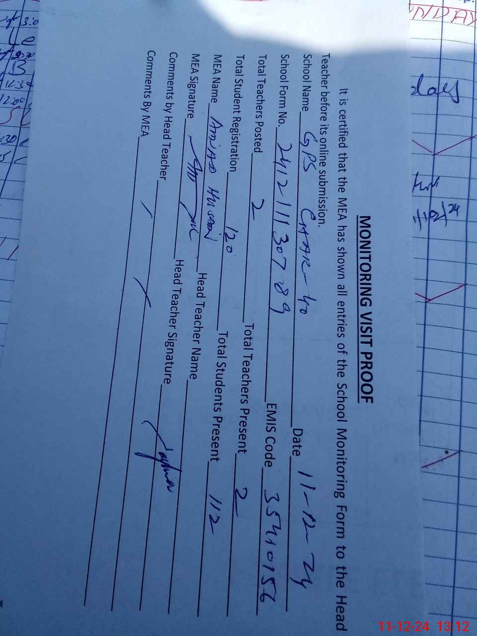 | Attendance Register | Head Teacher | MEA with School | Visit Proof |