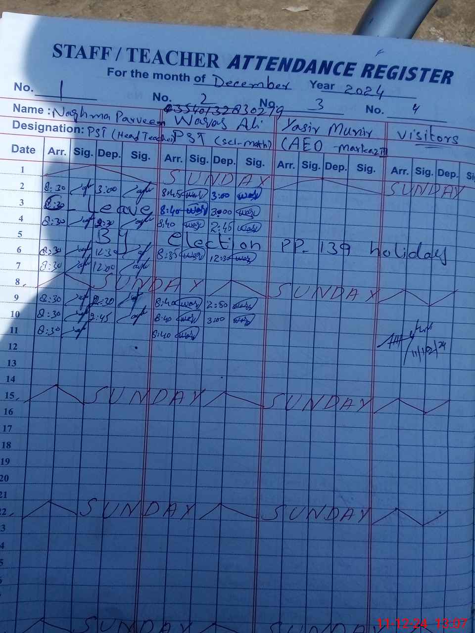 | CNIC | Full Name | Designation | R/C | Absence During Last Calender Month |