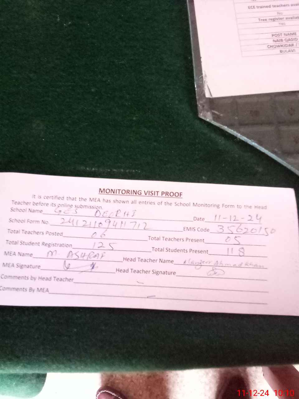 | Attendance Register | Head Teacher | MEA with School | Visit Proof |