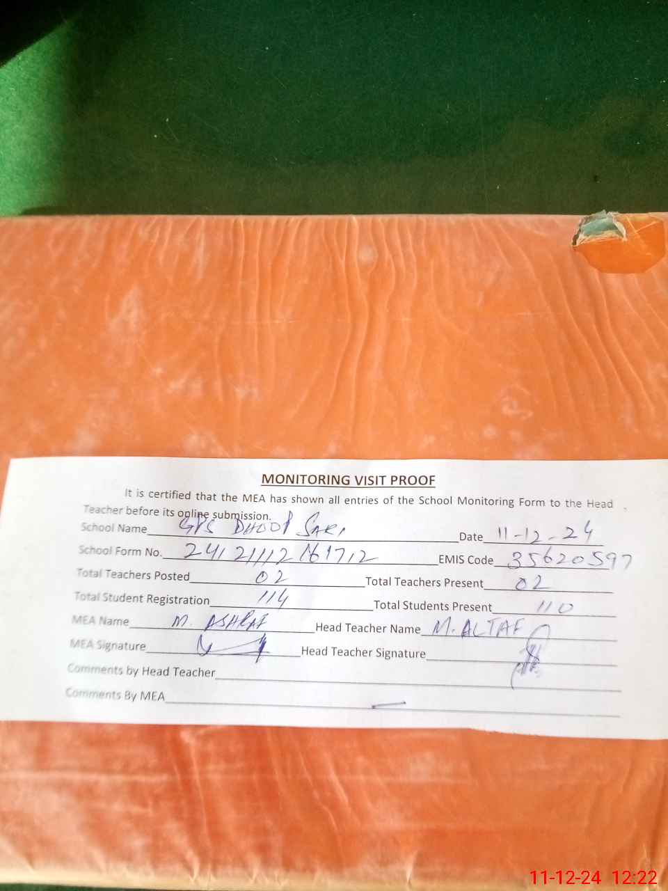 | Attendance Register | Head Teacher | MEA with School | Visit Proof |