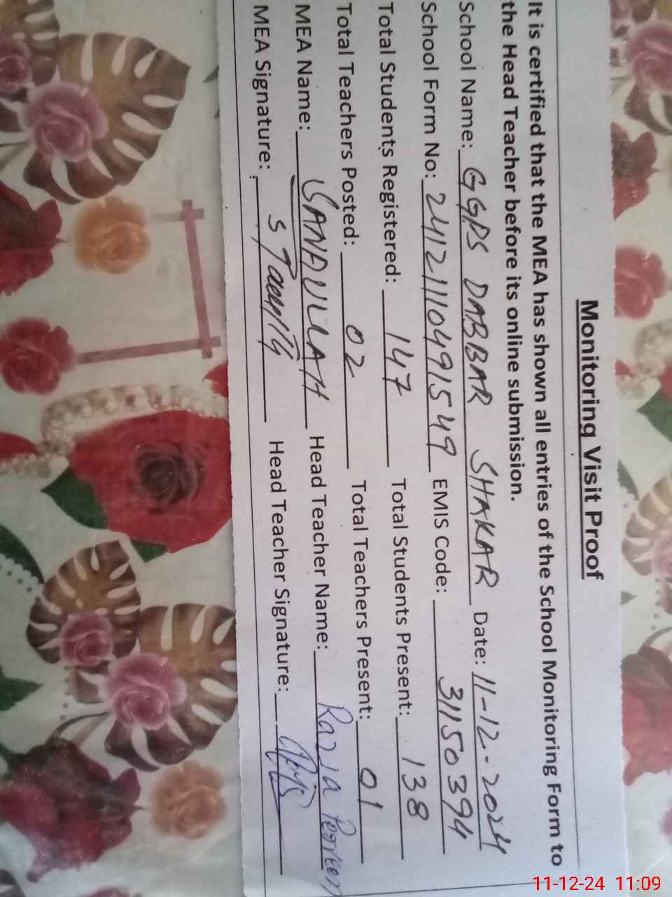 | EMIS Code: 31150394 | Name of School: GGPS DABBAR SHAKAR GUNJ | |||