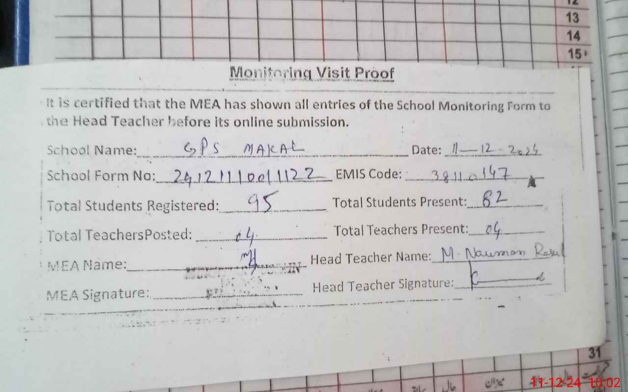 | Attendance Register | Head Teacher | MEA with School | Visit Proof |