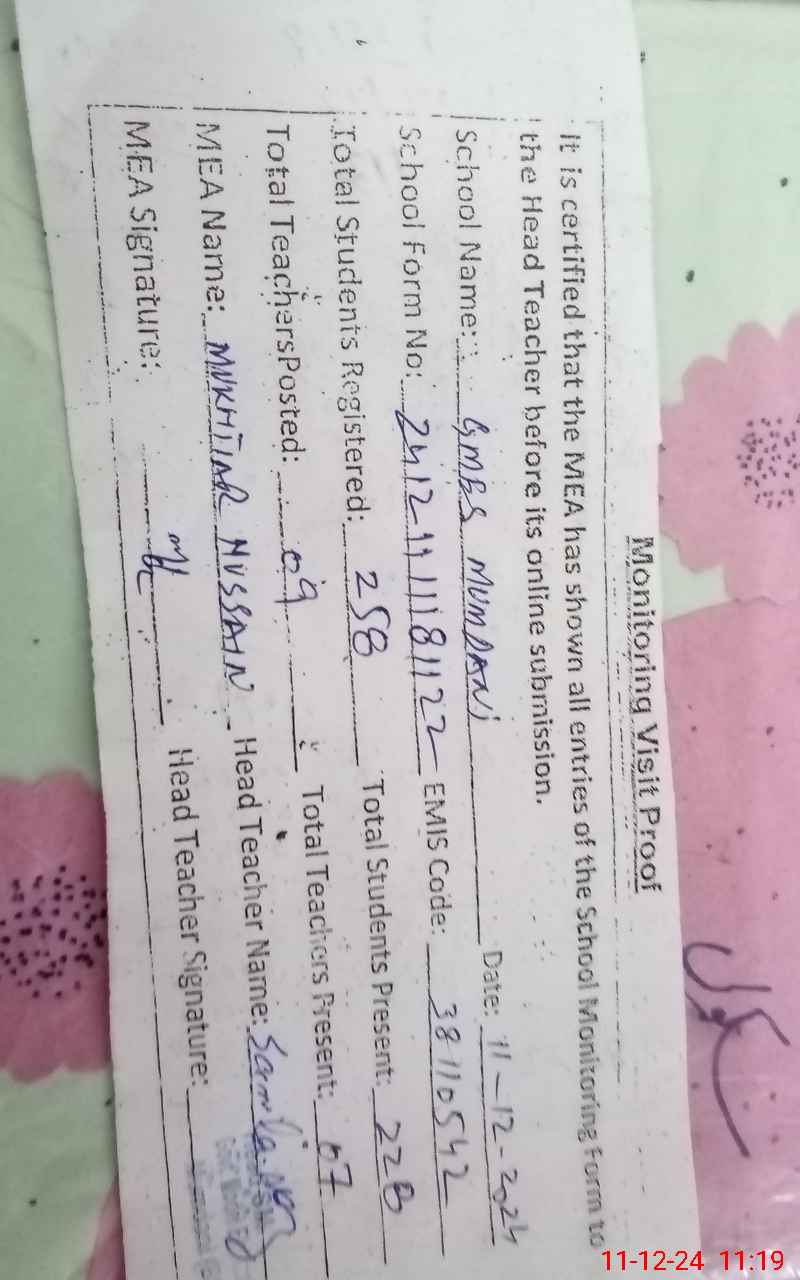 | Attendance Register | Head Teacher | MEA with School | Visit Proof |