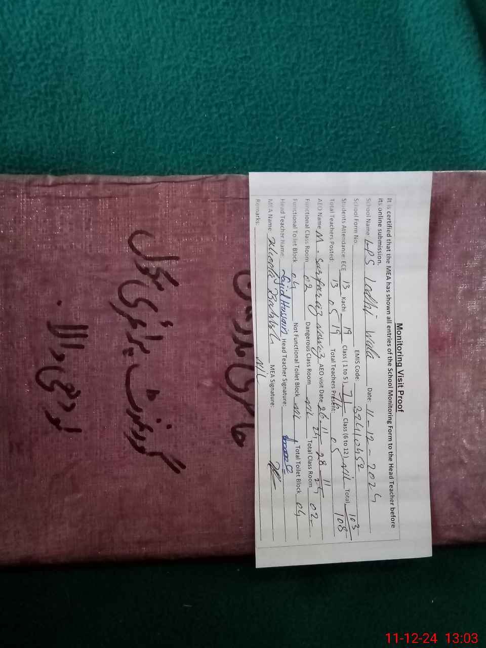 | Attendance Register | Head Teacher | MEA with School | Visit Proof |