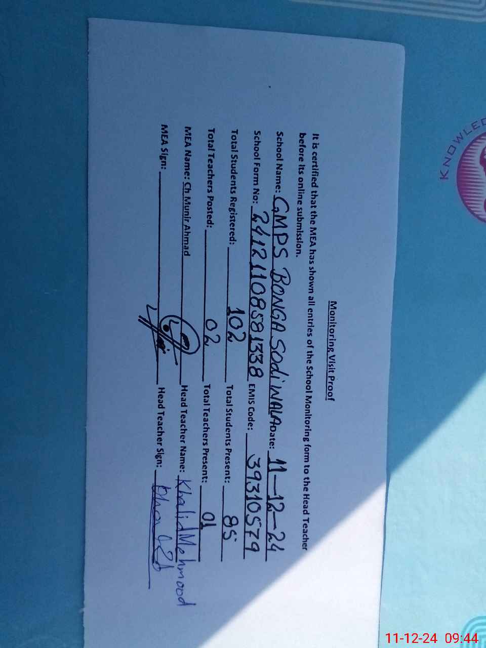| EMIS Code: 39310579 | Name of School: GMPS BONGA SODHI WALA | |||