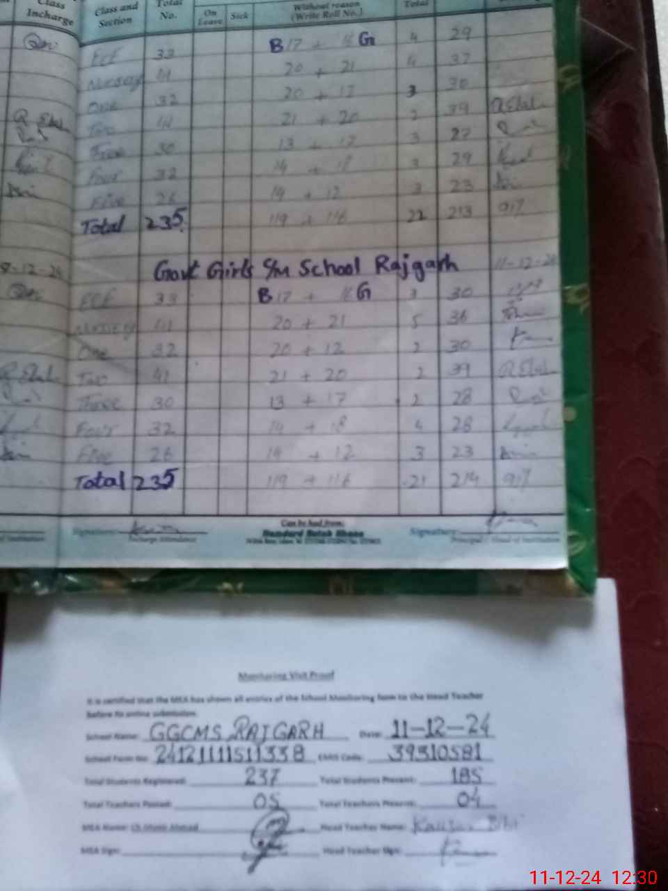 | Attendance Register | Head Teacher | MEA with School | Visit Proof |