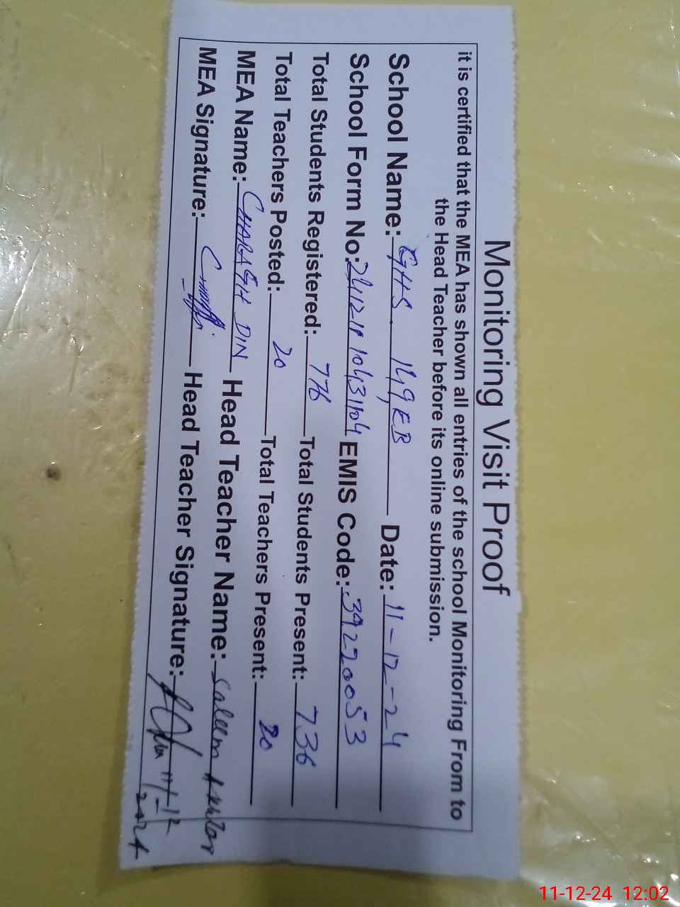| Attendance Register | Head Teacher | MEA with School | Visit Proof |