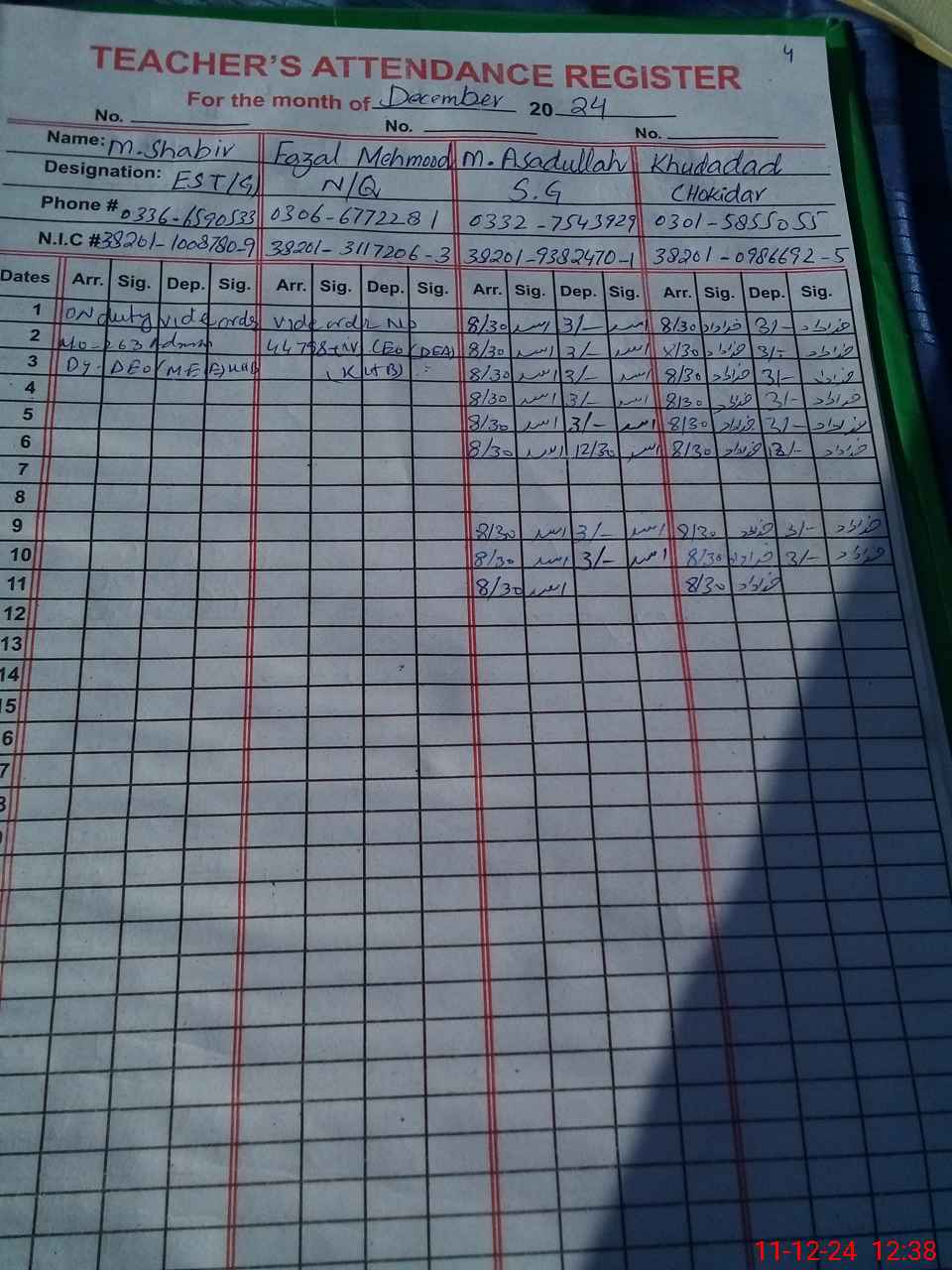 | CNIC | Full Name | Designation | R/C | Absence during last cal. month |
