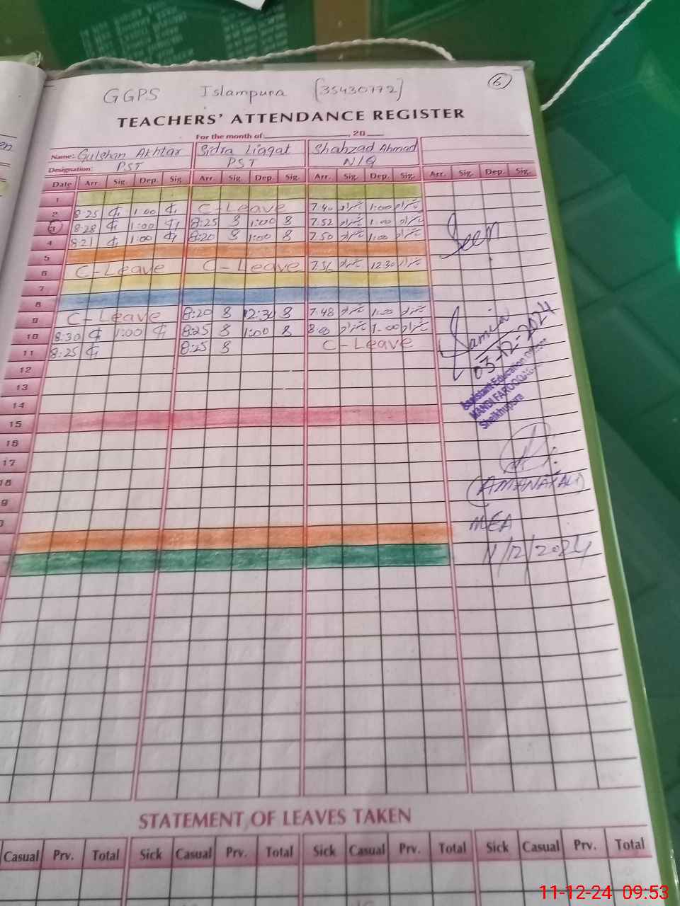 | CNIC | Full Name | Designation | R/C | Absence During Last Calender Month |