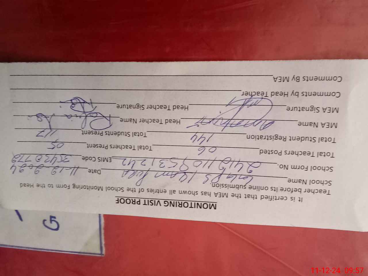 | Attendance Register | Head Teacher | MEA with School | Visit Proof |