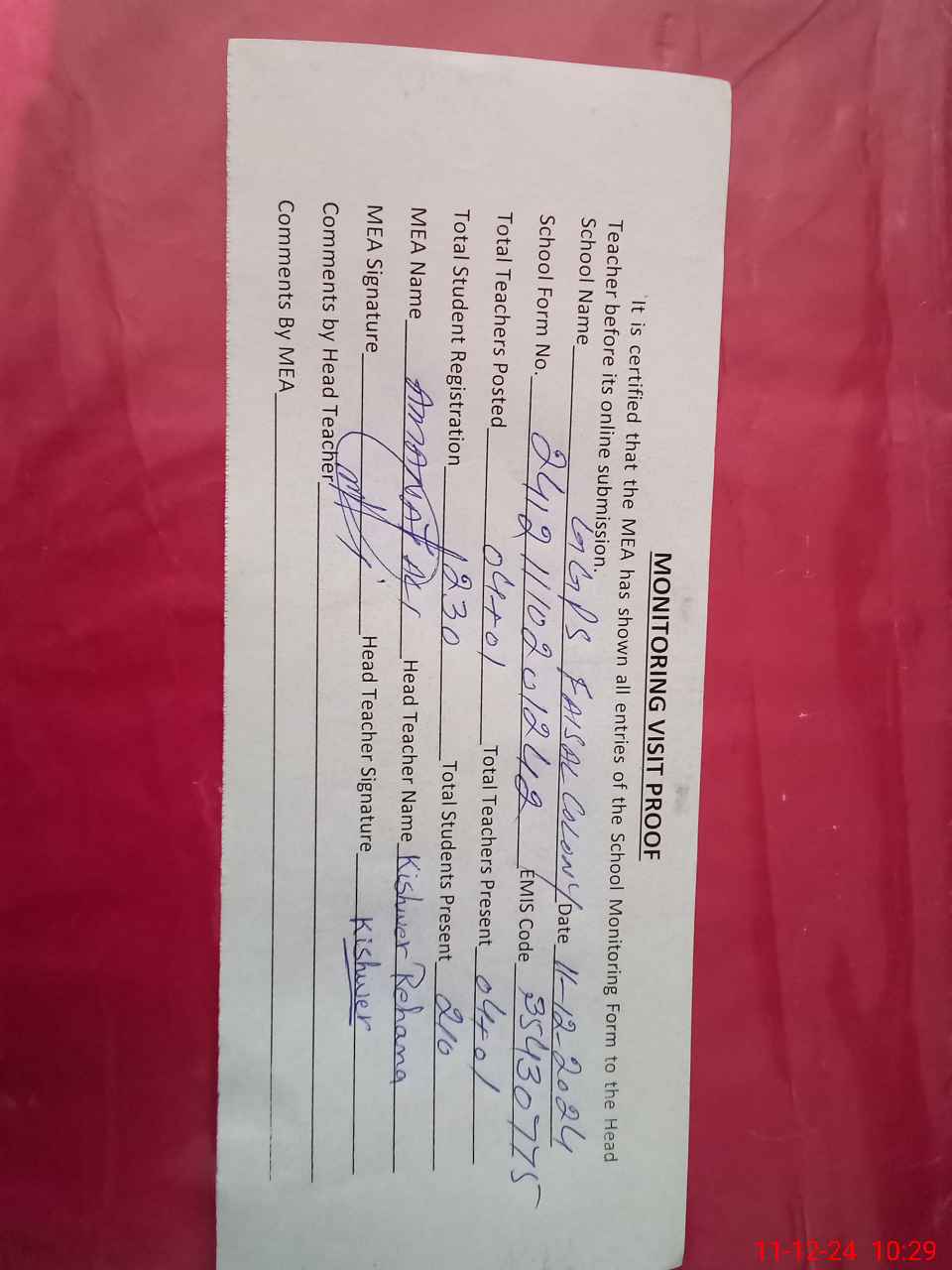 | Attendance Register | Head Teacher | MEA with School | Visit Proof |