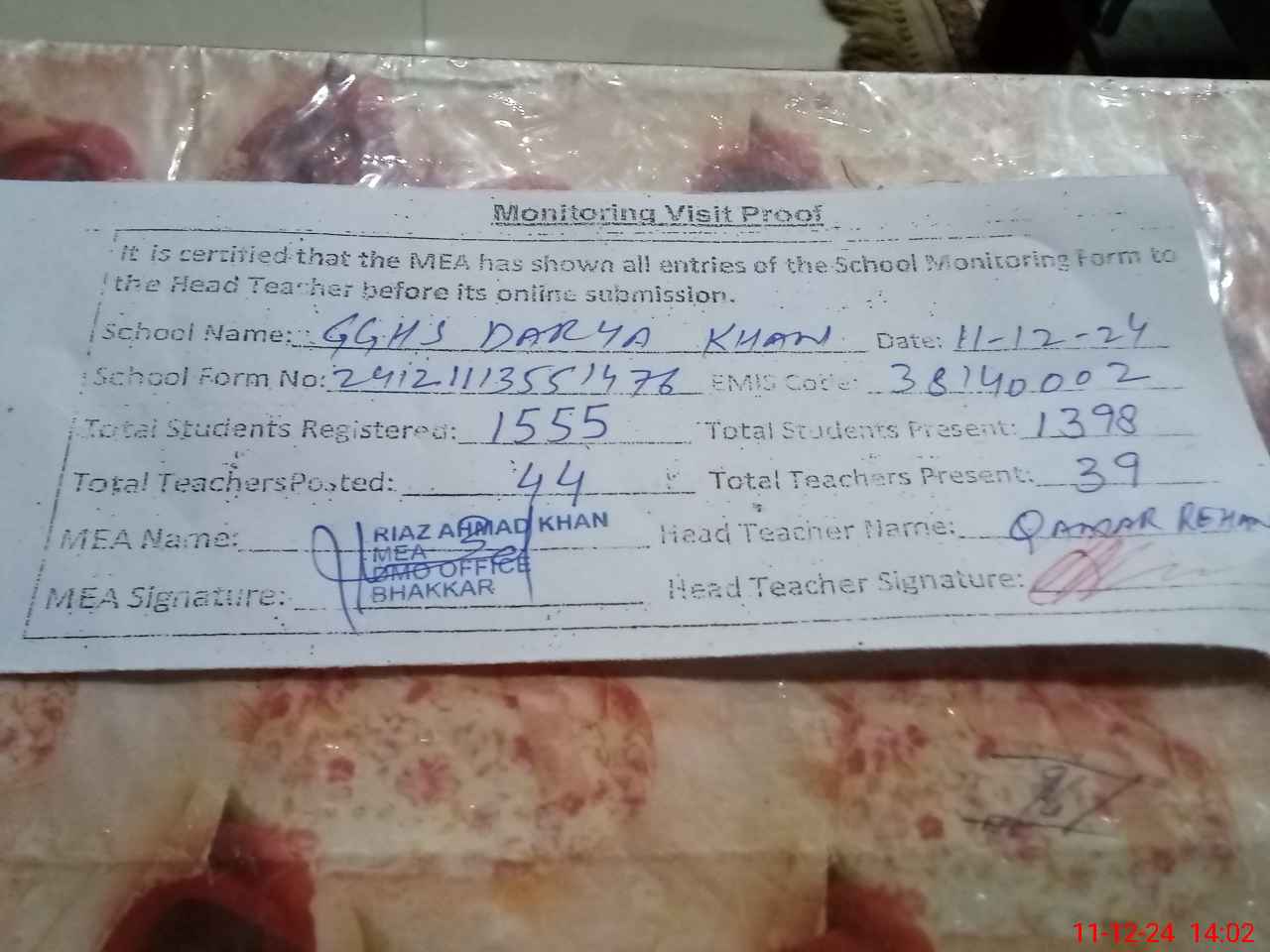 | EMIS Code: 38140002 | Name of School: GGHS DARYA KHAN | |||