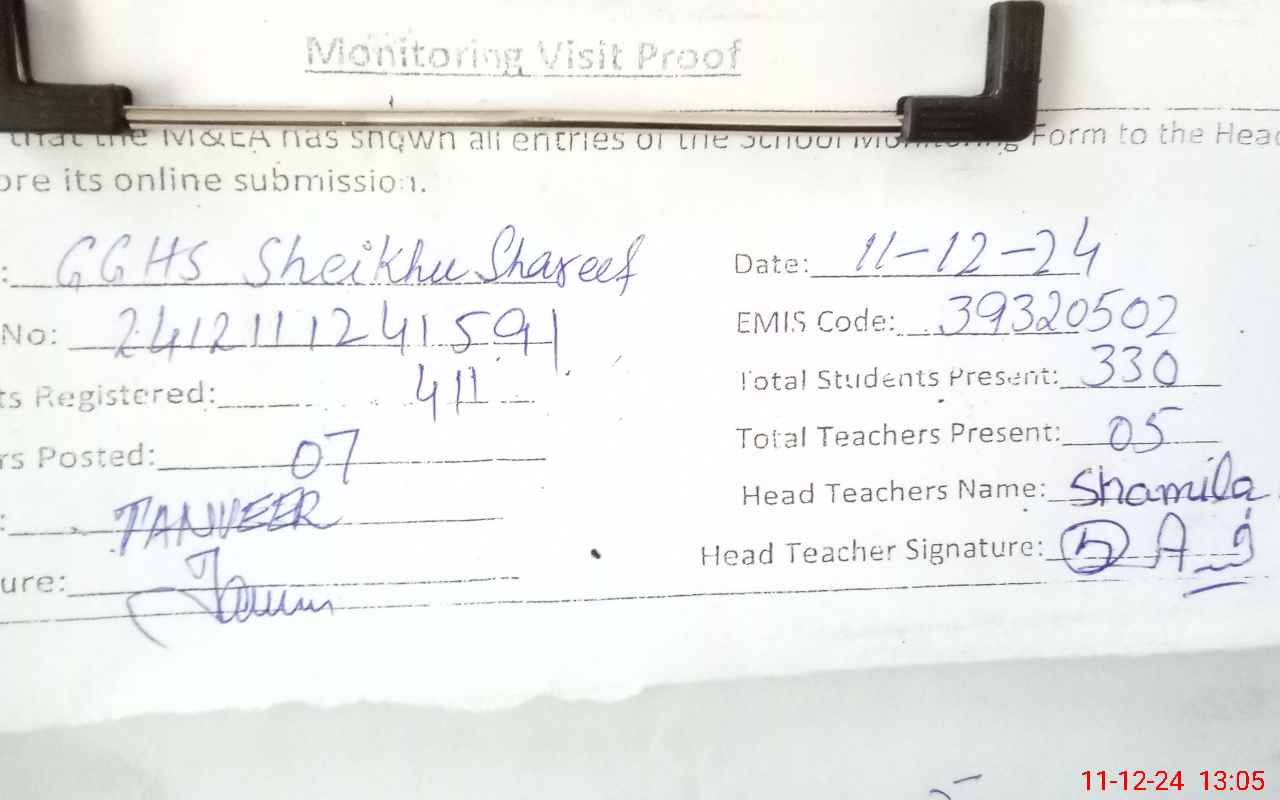 | EMIS Code: 39320502 | Name of School: GGHS SHEIKHU SHARIF | |||