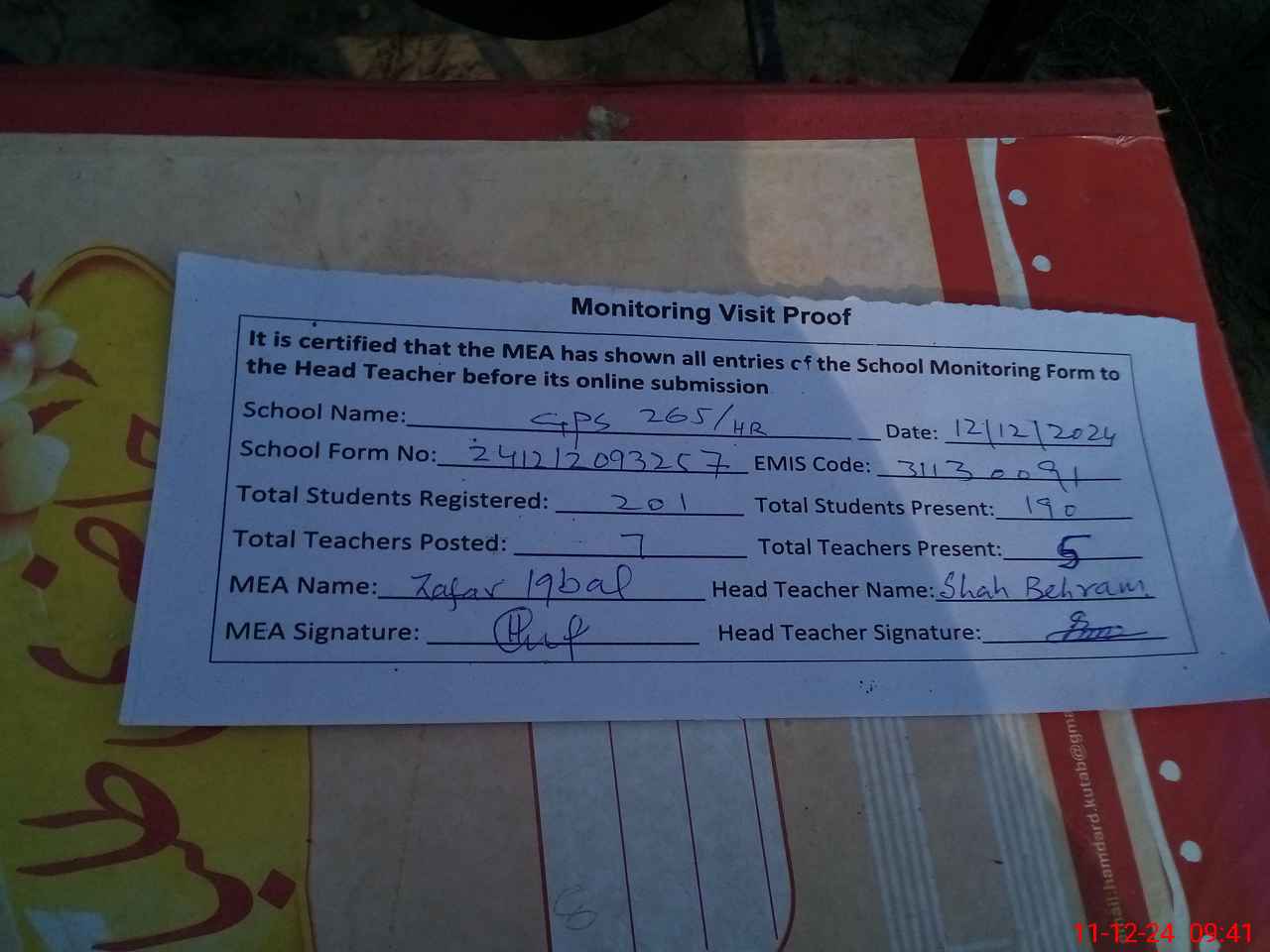| Attendance Register | Head Teacher | MEA with School | Visit Proof |