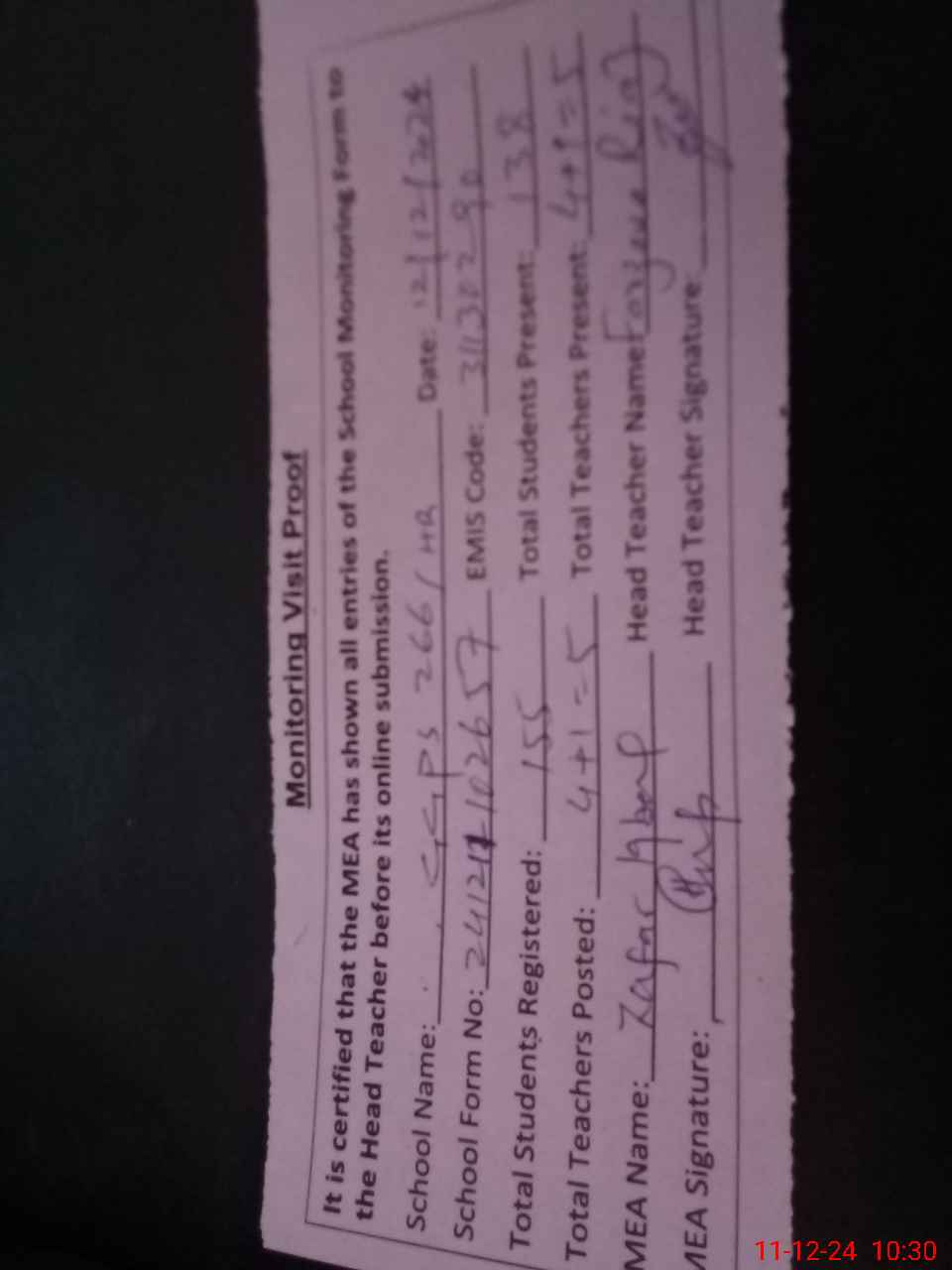 | Monitoring Date: 11-12-2024 | Start Time: 11-12-2024 10:20 AM | End Time: 11-12-2024 10:31 AM | Name of MEA: Za**** Iq**** BN**** | |