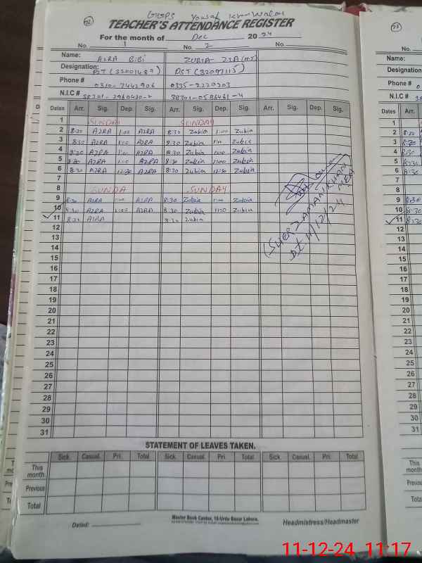 | CNIC | Full Name | Designation | R/C | Absence During Last Calender Month |