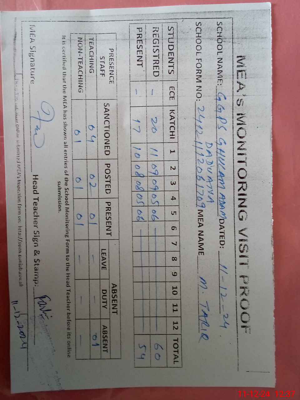 | Attendance Register | Head Teacher | MEA with School | Visit Proof |