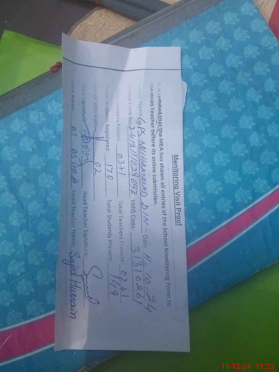 | EMIS Code: 31310261 | Name of School: GPS MUHAMMAD DIN | |||