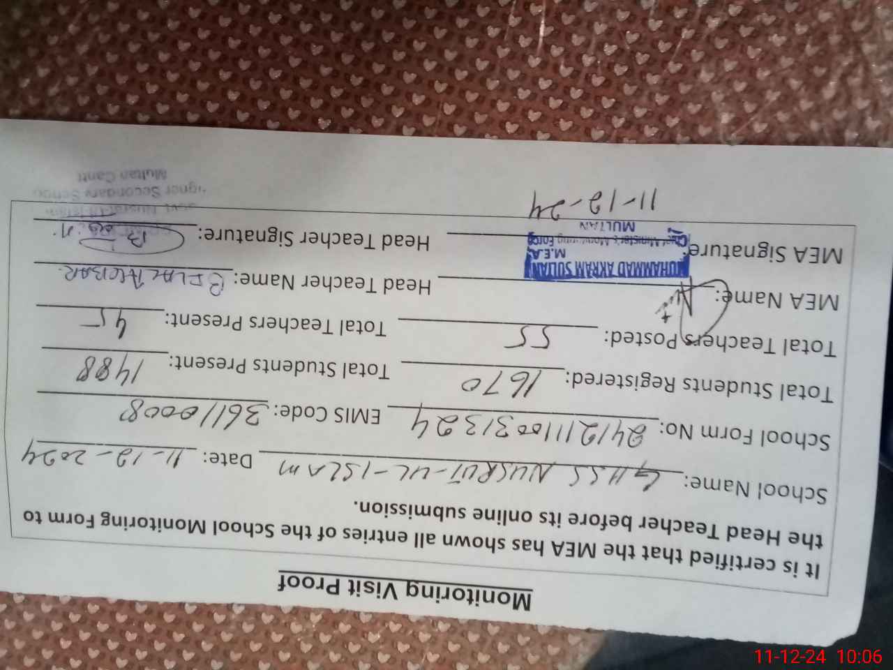 | Certified that this School was Inspected by the Undersigned MEA/DMO Today and the Information Stated Above is as Per Record. | |||||