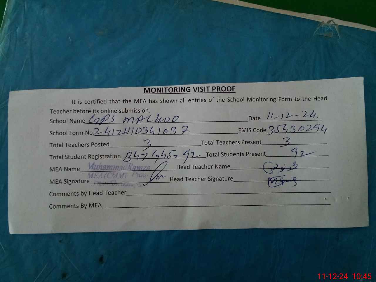 | Attendance Register | Head Teacher | MEA with School | Visit Proof |